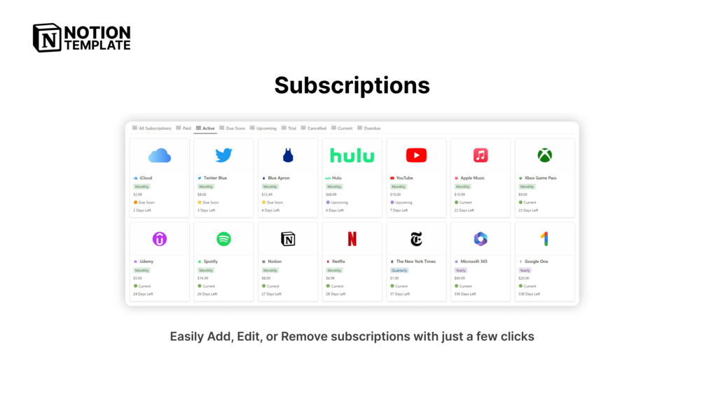 - Transaction Log: Keep a comprehensive record of all your subscription-related transactions. Never miss a payment again.